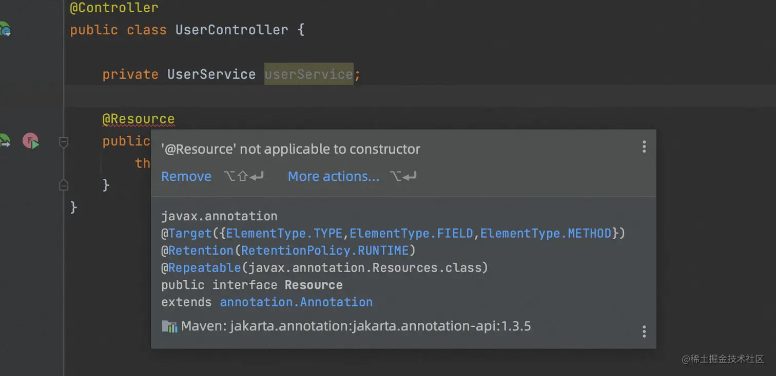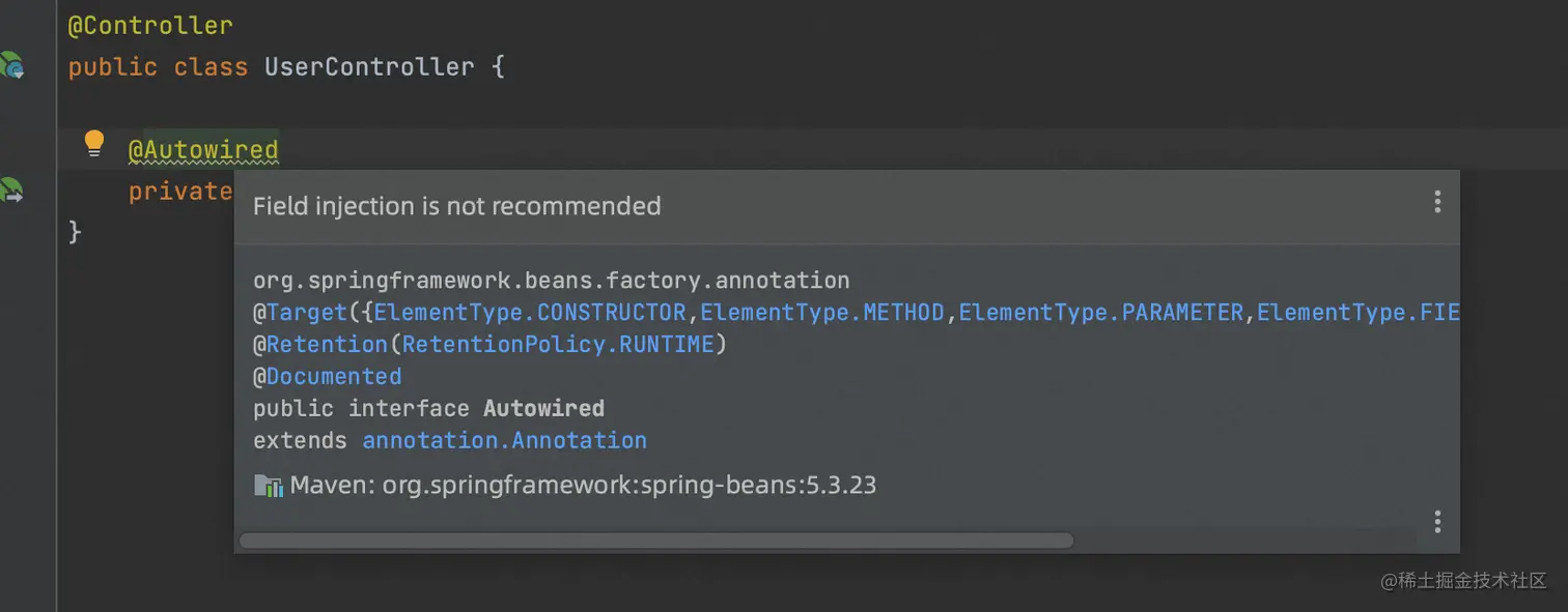 回到开篇的idea的警告,网上有很多人都赞同的一种说法是,@Resource是JSR规范,@Autowired是Spring提供,不推荐使用绑定了Spring的@Autowired,因为@Resource在更换了框架后,依然可以使用。我不太赞同这种说法,因为idea的错误提示很明确,Field injection is not recommended,不推荐使用属性注入的方式,那换成@Resource,我理解并没有解决这个问题,虽然idea确实不警告了,可能有点掩耳盗铃的意思。